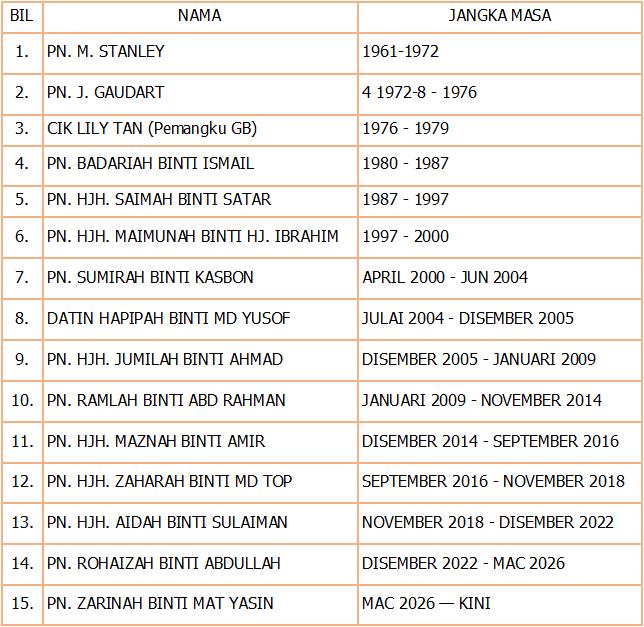 SENARAI NAMA GURU BESAR 1961 HINGGA KINI